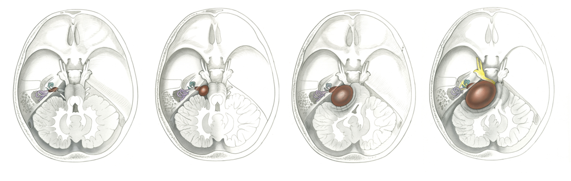 Différents stades du neurinome (d’après Jackler, ATLAS OF SKULL BASE SURGERY & NEUROTOLOGY. Thieme. ©2009)