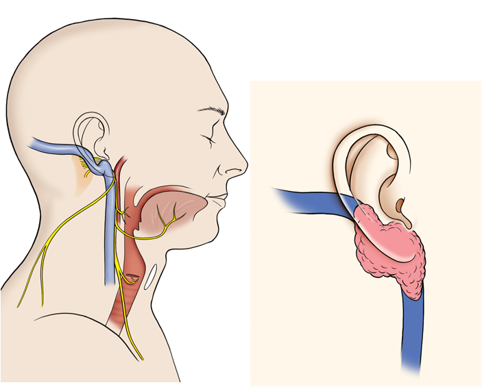 Les tumeurs Glomus jugulaire sont rares. Il s’agit de tumeurs à croissance lente qui commencent dans l’os temporal (os de l’oreille) et se propagent à travers l’oreille. Les symptômes les plus courants sont des acouphènes pulsatiles ou une perte auditive. La tumeur peut se propager par la suite vers le cerveau, le nerf facial et l’oreille interne, affectant l’audition et de l’équilibre.